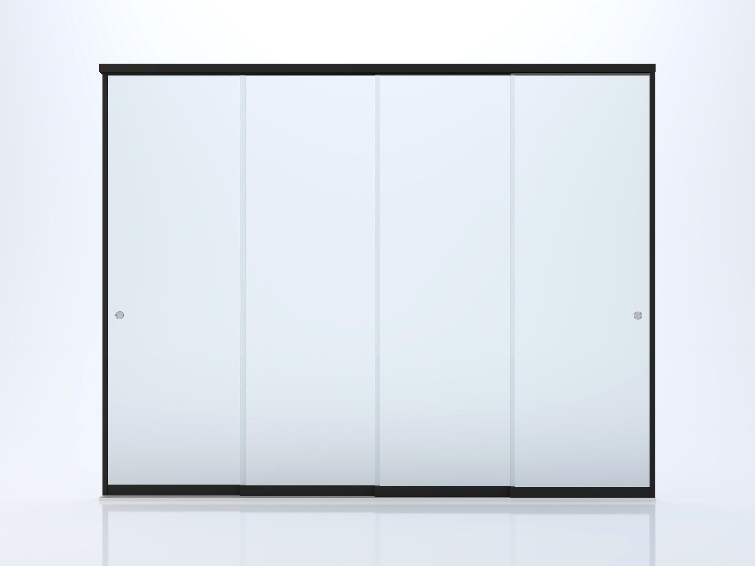 Vaizdas iš išorės: 4 bėgelių ir 4 slankiojančių dalių, berėmės stiklinės stumdomos durys.