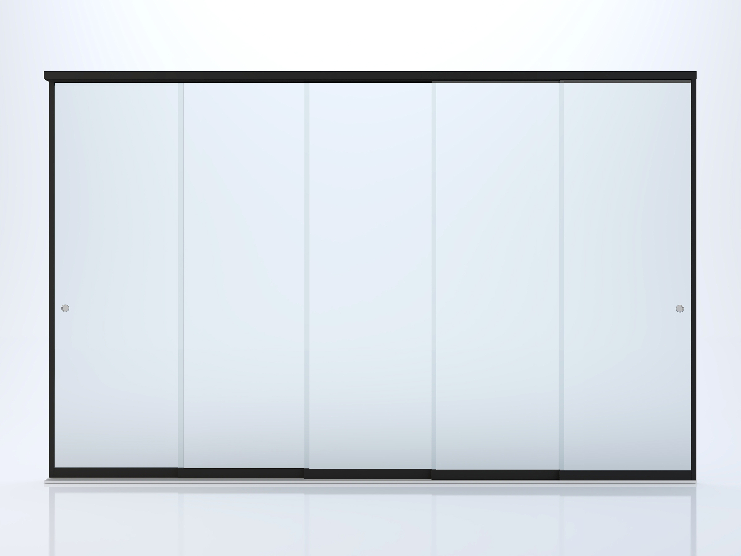 View from the outside: 5 rails and 5 sliding sections, frameless-type glass sliding doors.