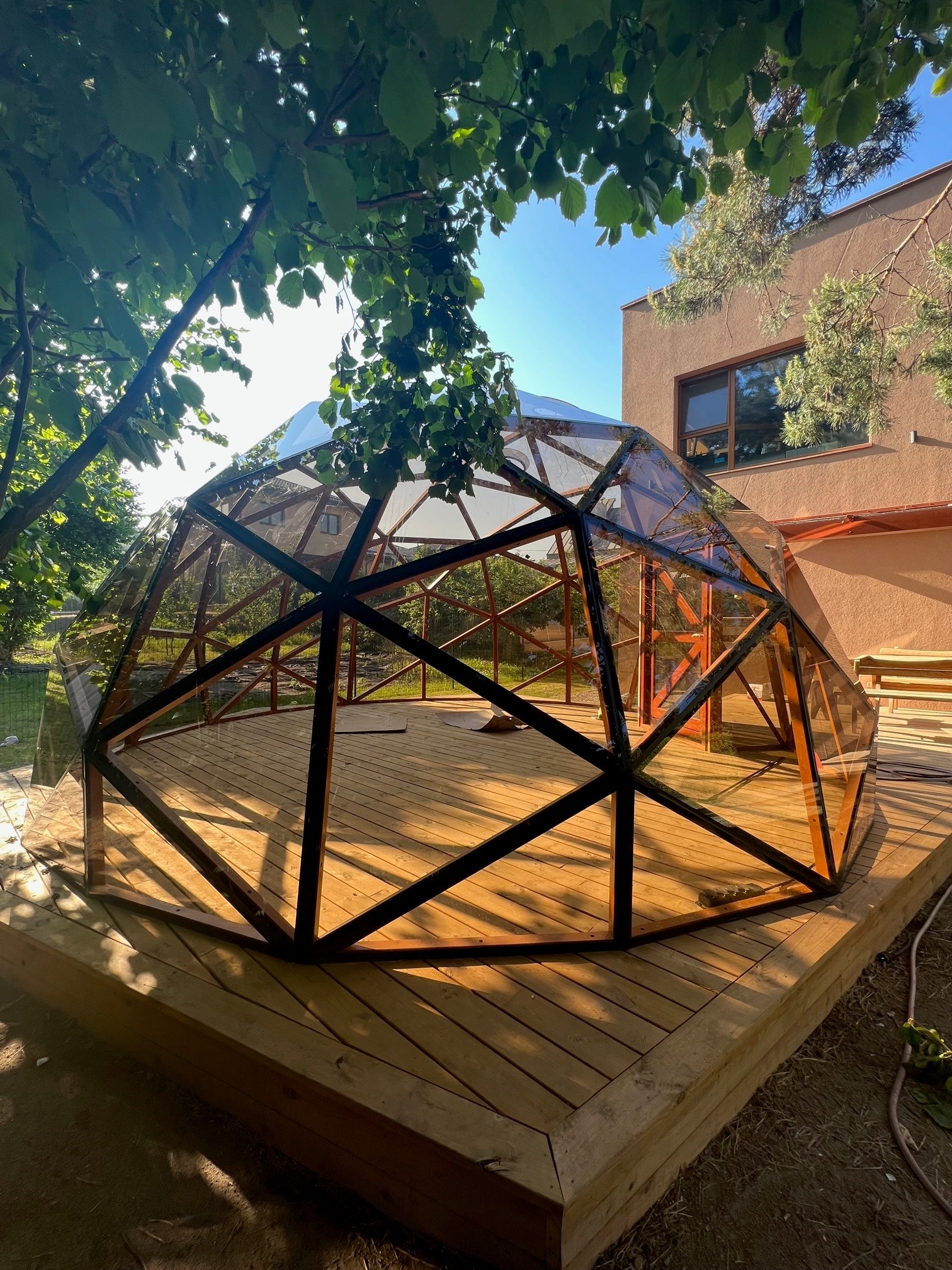 The glass-covered dome is another outstanding feature, allowing natural light to penetrate inside and creating a bright and spacious atmosphere, reducing reliance on artificial lighting during the day. The glass-covered dome offers endless possibilities for use, whether it's a stylish and functional living space, a relaxation area, an artist's studio, or a unique venue for events. We use only safe glass for glazing, often tinted or mirrored. Additionally, for those seeking a fully insulated structure, we can offer a dome with a glass packages.
